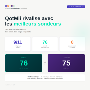 Sans poser une seule question, sans terrain et sans budget comparable aux instituts traditionnels, QOTMII obtient un score de précision de 76/100, soit un résultat statistiquement équivalent (voire légèrement supérieur) aux meilleurs sondeurs (75/100 sur la même période).